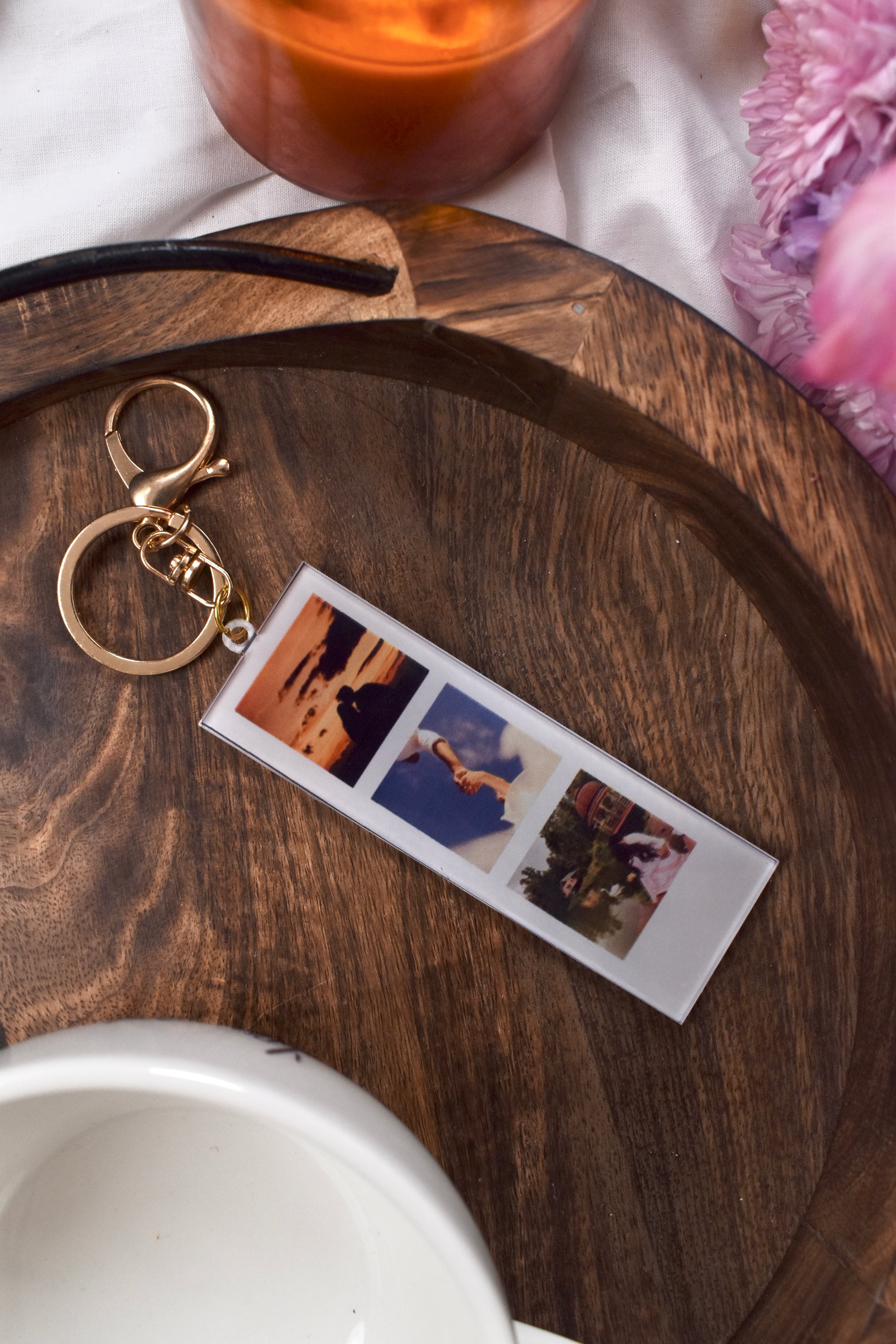 Four Moments on the Go. This practical and stylish keychain captures three moments on one durable tag. It’s the perfect way to keep your favorite memories, secured to your keys or bag, offering a quick, personal glance at your happy moments.